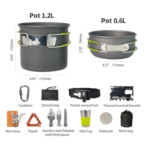 Specification: WAILAMHK Camping Cookware Mess Kit, 16 pcs Backpacking Cooking Set, Lightweight Camping Pots and Stove Set for 1-2 Person, Outdoor Cooking Gear Ideal for Camping, Hiking, Backpacking and Picnic
